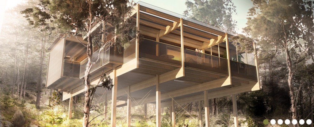 Inspirationen kommer från Kaliforniska stilthouses, men även Japanska influenser kan spåras i den spektakulära arkitekturen där vissa hus kommer att stå på uppåt 10 meter höga styltor på de brantaste platserna. Husen nås endast via landgångar från bergssluttningen men handikappanpassade för att passa även äldre.